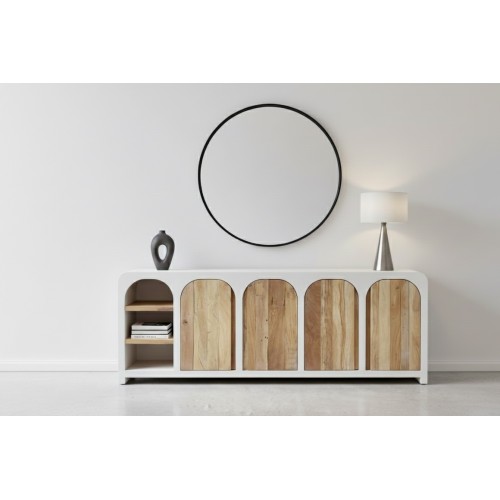 Sa structure en bois revêtu de béton peint, aspect minéral blanc cassé mat, apporte un esprit brut et authentique, rappelant les murs blanchis à la chaux des îles grecques. Ce rendu minéral contraste harmonieusement avec les portes en acacia recyclé massif, dont le bois dévoile un veinage chaleureux et naturellement irrégulier, rendant chaque buffet unique.