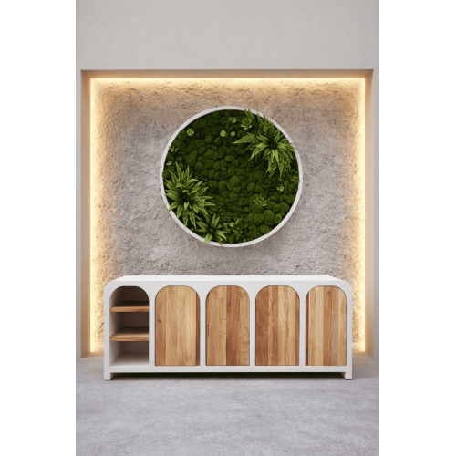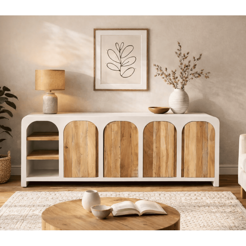 Invitez l'esprit des Cyclades dans votre intérieur avec le buffet Mykonos, un meuble au design solaire inspiré des maisons blanches des Cyclades et de l'art de vitre méditerranéen. Ses lignes douces et contemporaines évoquent immédiatement les ruelles lumineuses de Mykonos, entre simplicité, chaleur et élégance naturelle.