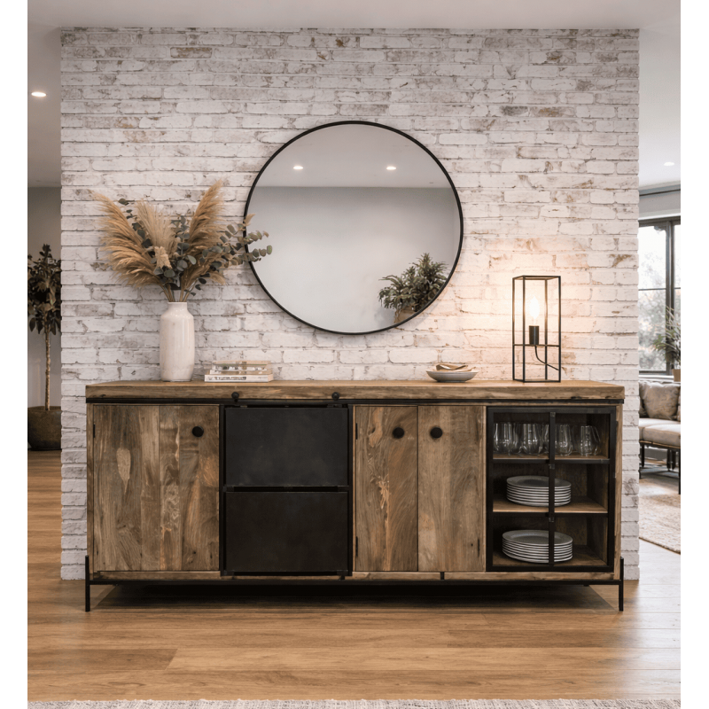 Apportez du caractère à votre intérieur avec ce buffet au style industriel affirmé. Véritable mariage entre l’authenticité du bois de manguier massif et la robustesse du métal noir, ce meuble de rangement s’impose comme une pièce maîtresse dans un salon ou une salle à manger. Doté de larges compartiments fonctionnels, ce buffet bois et métal allie esthétique brute, praticité et rangement intelligent pour un intérieur organisé avec style. Idéal pour une décoration loft, vintage, moderne ou industrielle.